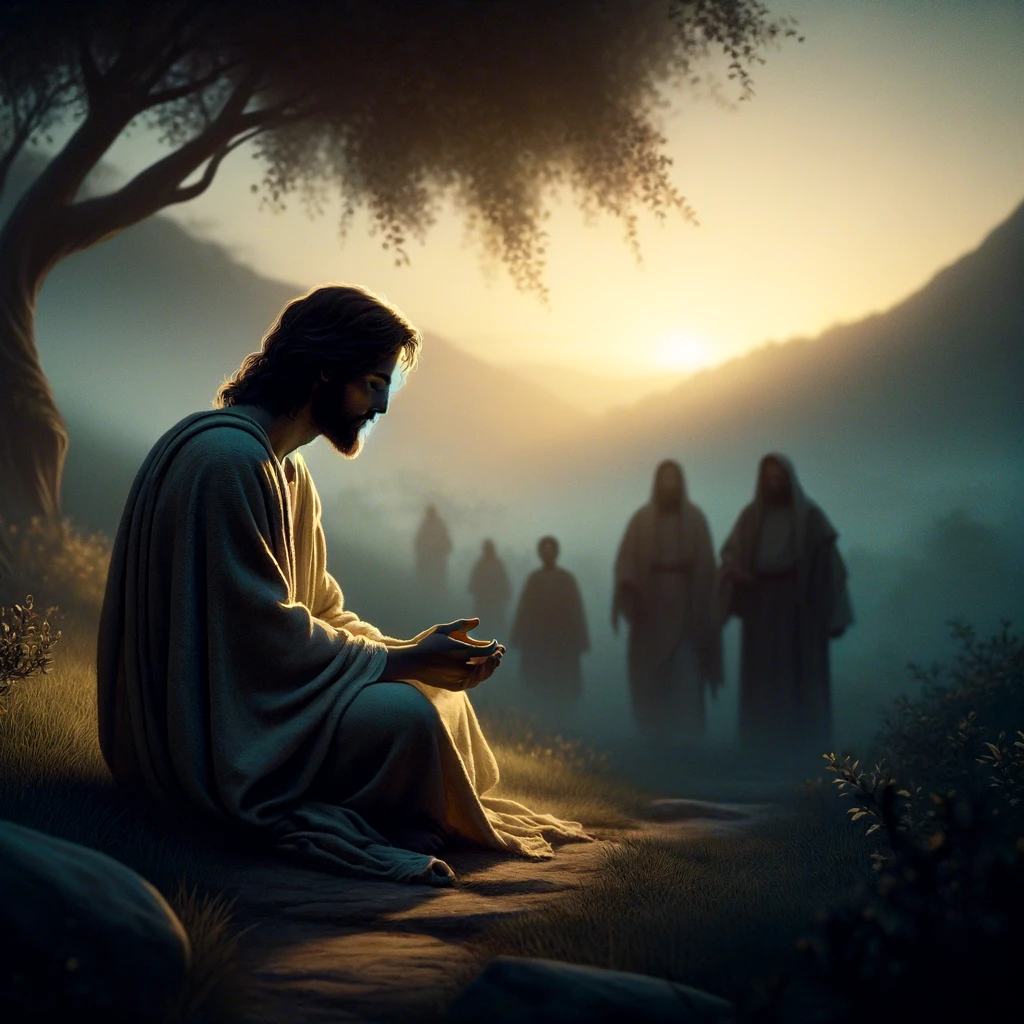 The image captures a serene and contemplative scene set in the early morning, depicting Jesus in a solitary place engaged in prayer, with Simon and others quietly approaching in the background.