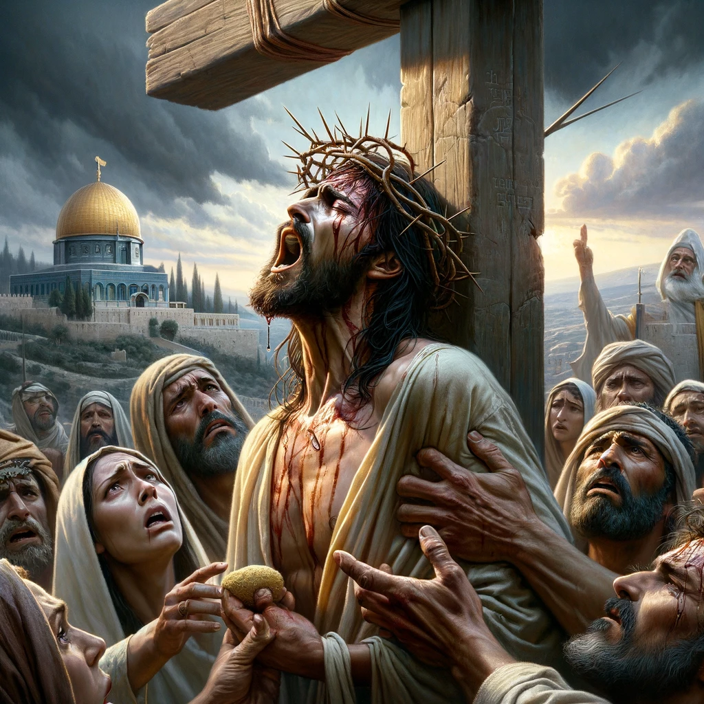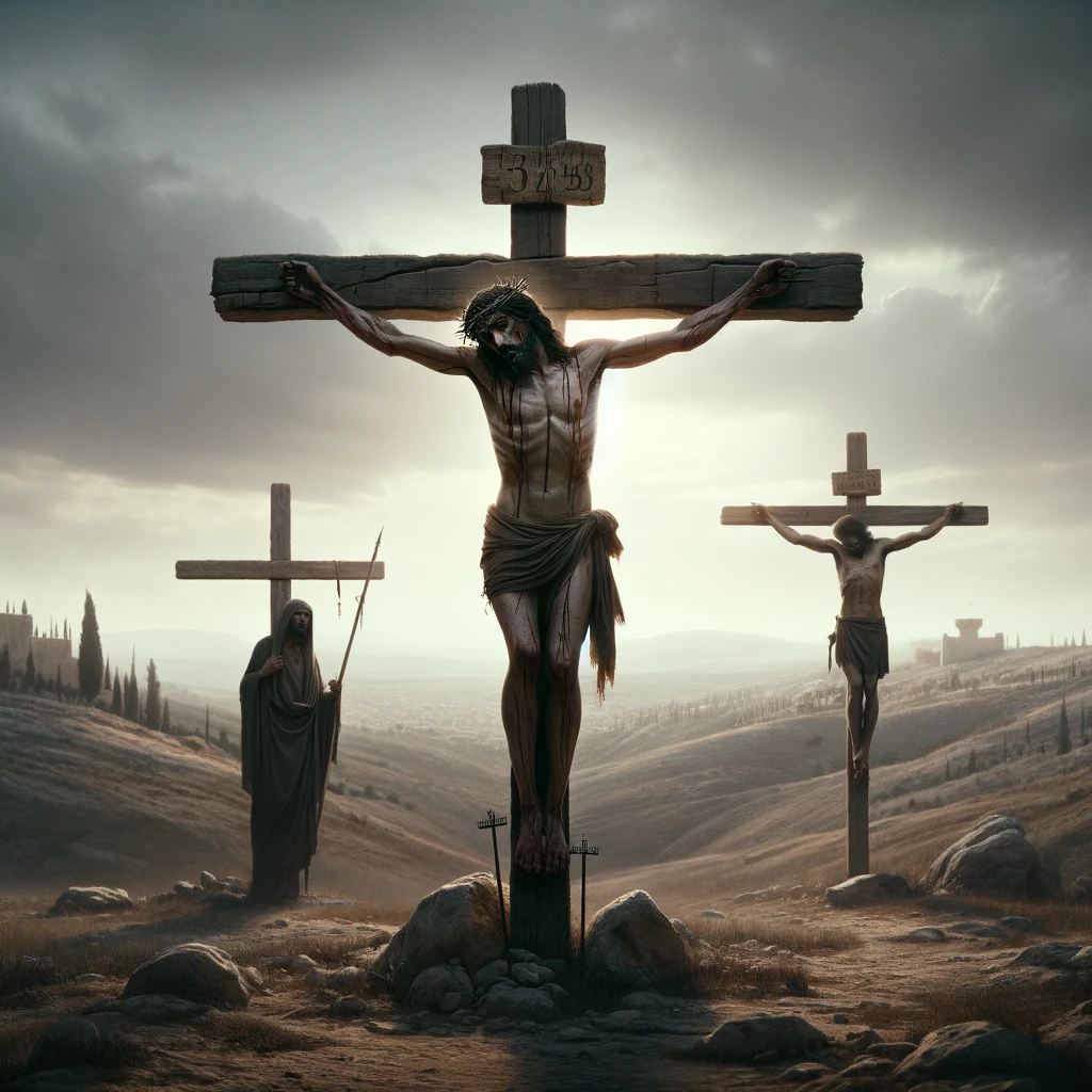The image depicting the scene of Jesus crucified on the cross, with two thieves crucified on either side of him, has been created. The setting is outside ancient Jerusalem, with the scene cast under an overcast sky, enhancing the solemnity of the moment.