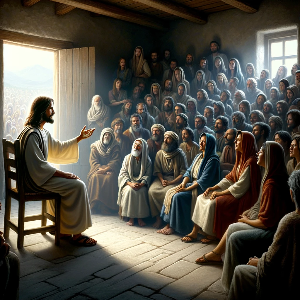 The image portrays a moment of spiritual teaching by the sea, with Jesus standing on a large boat close to the shore, addressing a vast and diverse crowd gathered on the land.