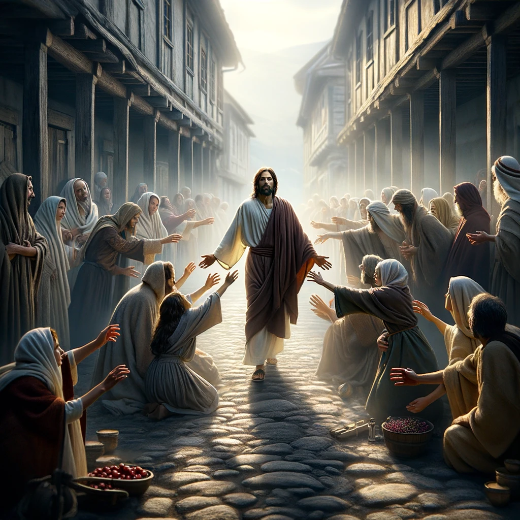 The image portrays a compassionate scene in a historical village street, where individuals gathered with their sick loved ones reach out to touch the garment of Jesus as he walks by, their expressions filled with hope and faith.