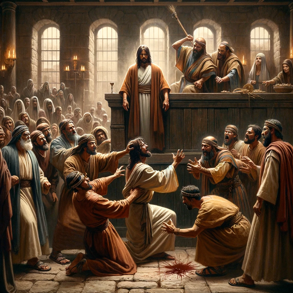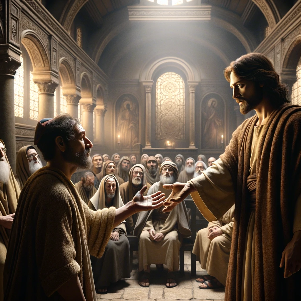 The image depicts a poignant scene inside a synagogue, where Jesus, standing with compassion and determination, heals a man with a withered hand, amid the watchful and skeptical eyes of the Pharisees.