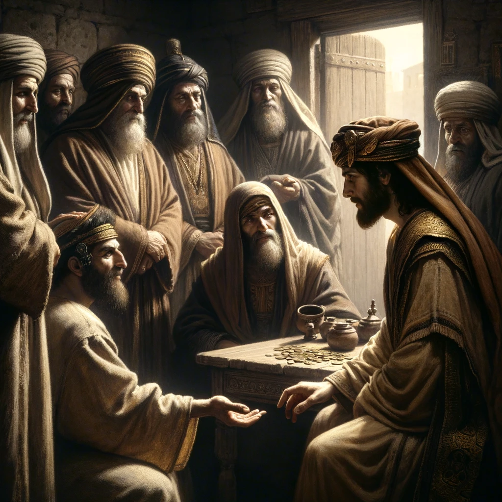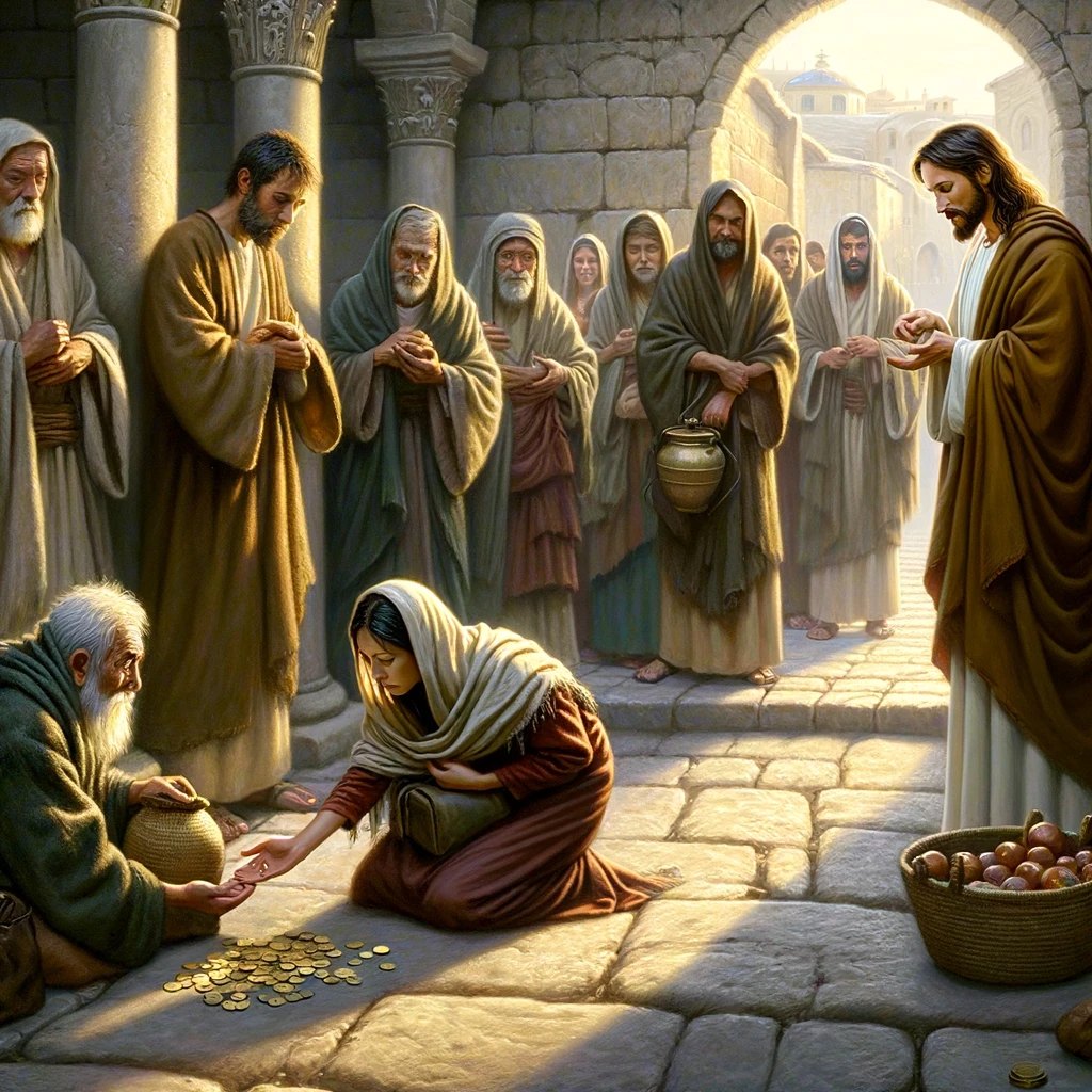 Here is the image depicting the scene where a poor widow discreetly offers two small coins into the temple treasury, as described in the passage. The image captures her act of sacrifice and generosity, contrasted with the less sincere donations of wealthier individuals. Jesus and his disciples are seen observing from a distance, acknowledging the profound significance of the widow’s humble offering.