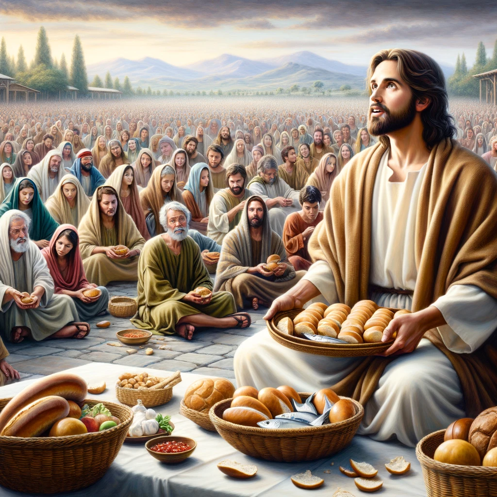 The image depicts the miraculous feeding of the five thousand, showing Jesus in the center blessing and breaking the loaves and fish, surrounded by his disciples and a diverse multitude seated in orderly rows, all partaking in the abundant meal.