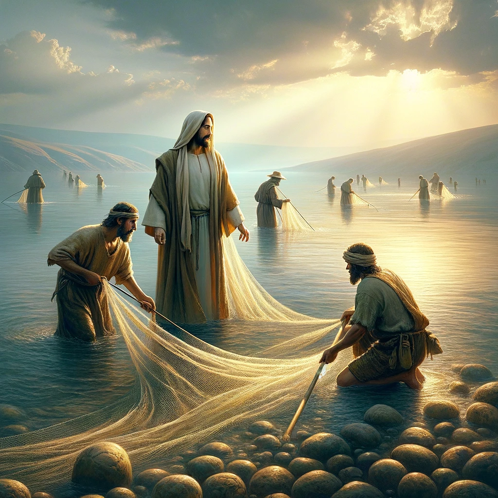 The image illustrates the moment by the Sea of Galilee where Jesus encounters Simon and Andrew casting their net into the sea, and invites them to become ‘fishers of men’.