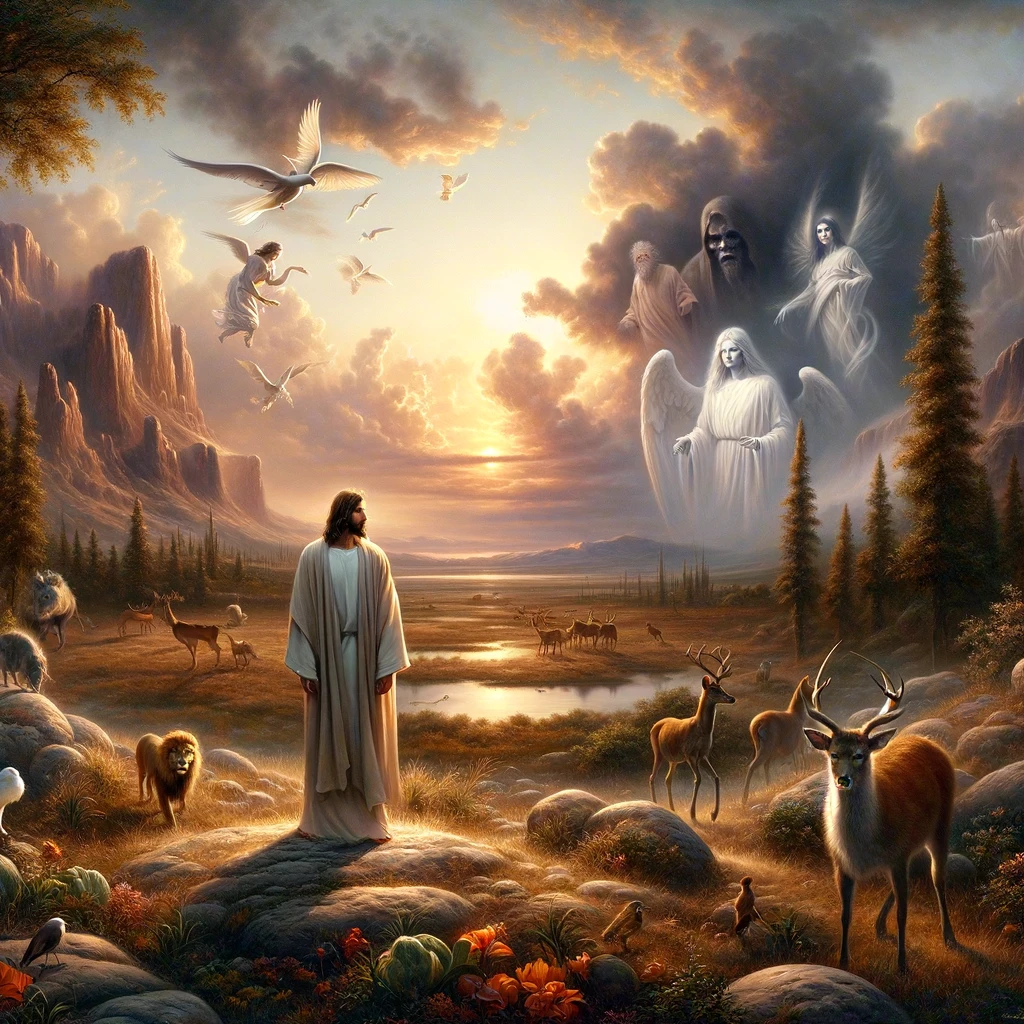 Here is the image depicting the scene where the Spirit guides Jesus into the wilderness, where he stays for forty days, faces temptations, and is among wild beasts, while angels minister to him.