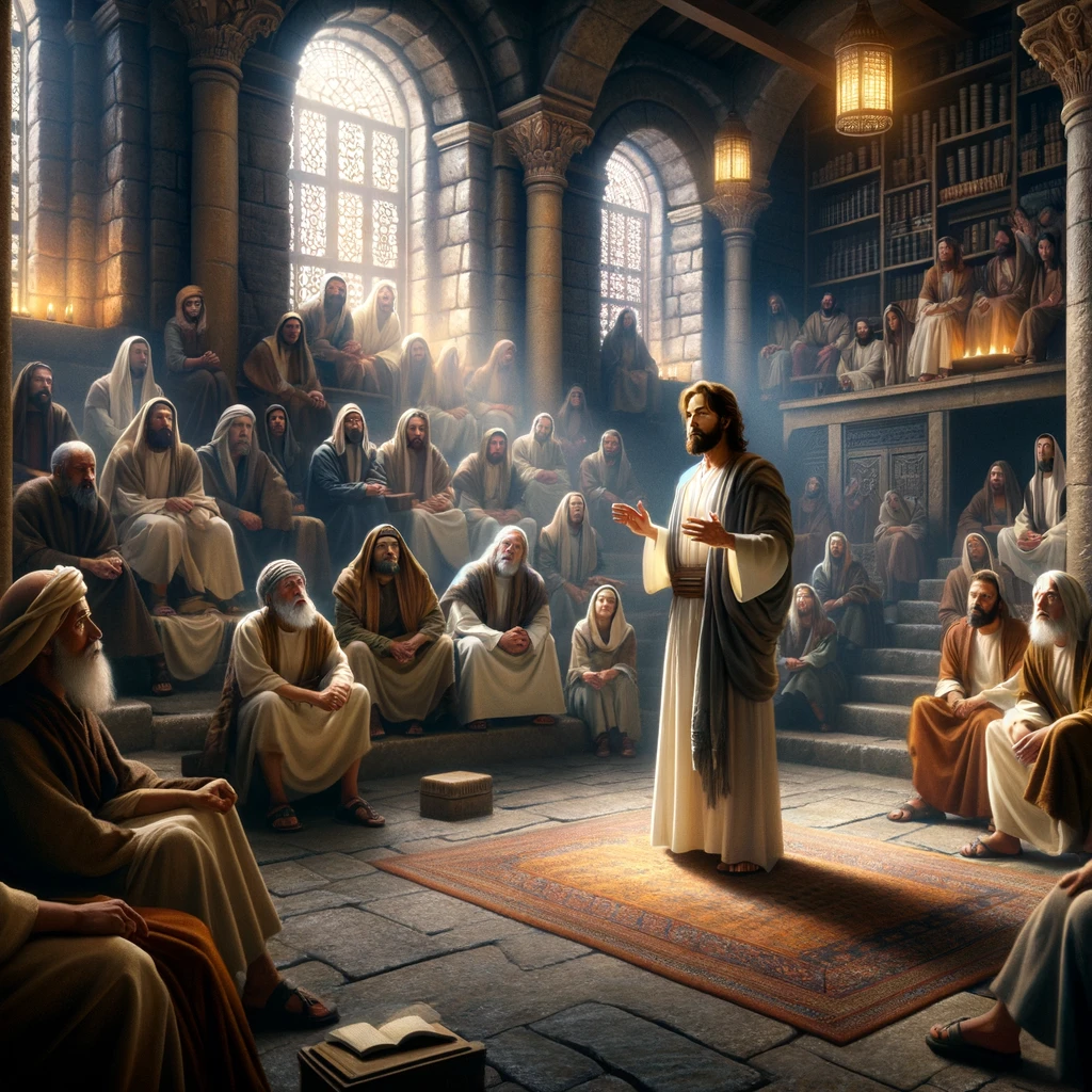 The image portrays the scene inside a synagogue in Capernaum, capturing the moment of Jesus’ teaching and the profound impact it had on the audience, including the man with an unclean spirit.