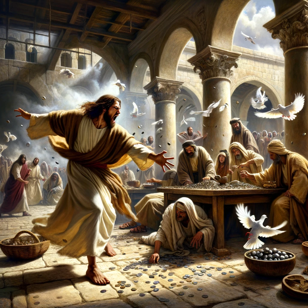 Here is the image depicting the scene where Jesus energetically overturns the tables of the moneychangers and the seats of those selling doves in the temple at Jerusalem.