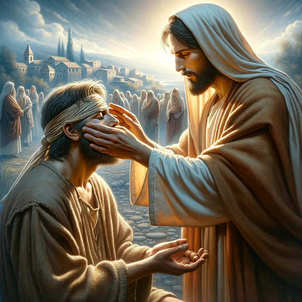 The image captures the poignant and transformative moment of the blind man’s healing at Bethsaida, with Jesus compassionately guiding and healing him, set against a serene landscape.