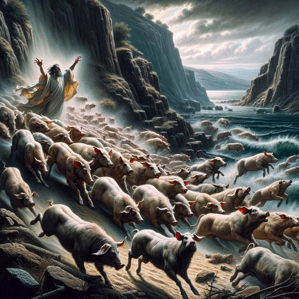 The image vividly depicts the dramatic scene where a herd of swine, possessed by unclean spirits, runs chaotically down a steep incline towards the sea, with Jesus in the background having just permitted the spirits to enter the animals.