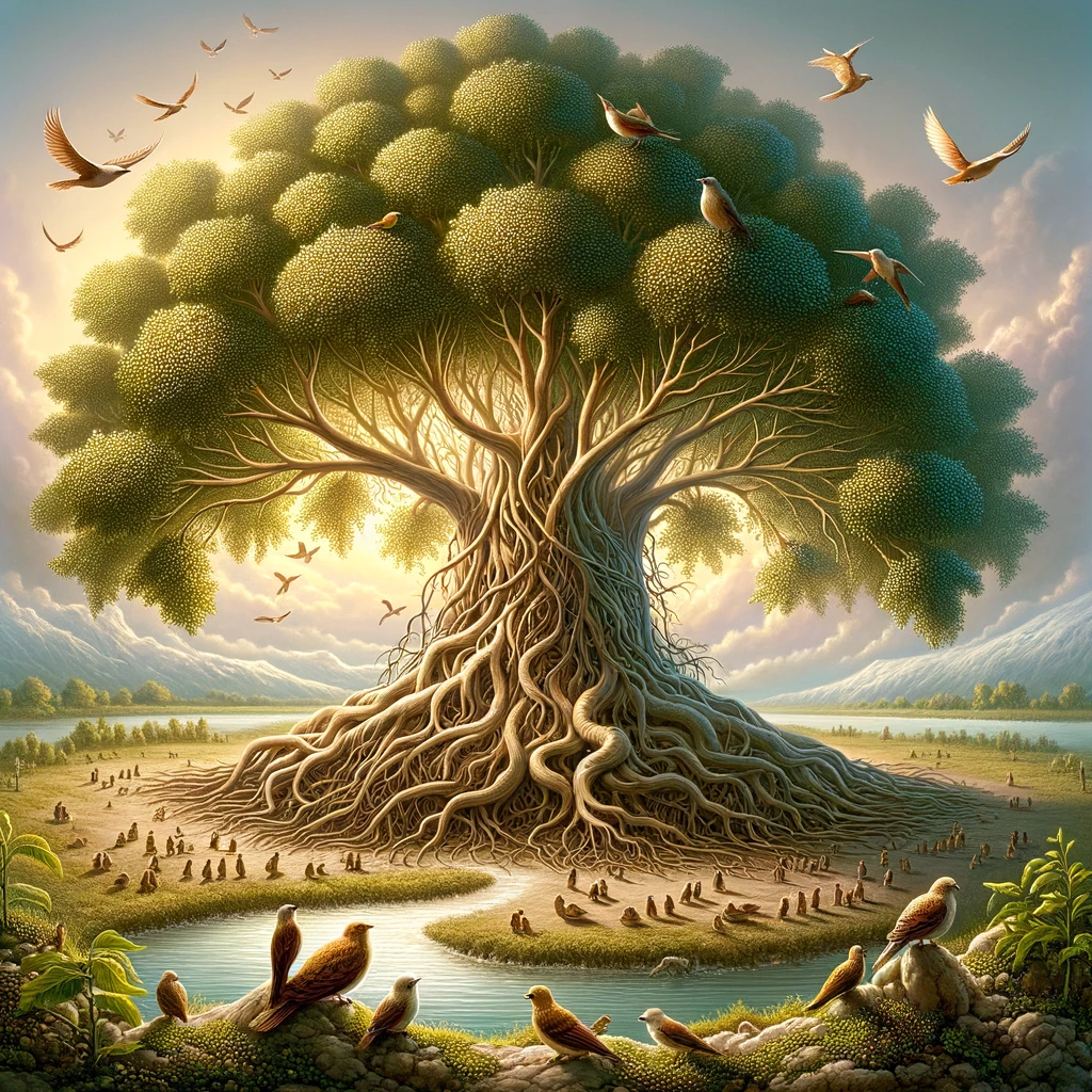The image portrays the Parable of the Mustard Seed, depicting a grand mustard plant that has grown from a tiny seed, with birds finding shelter under its expansive branches, set against a serene landscape.