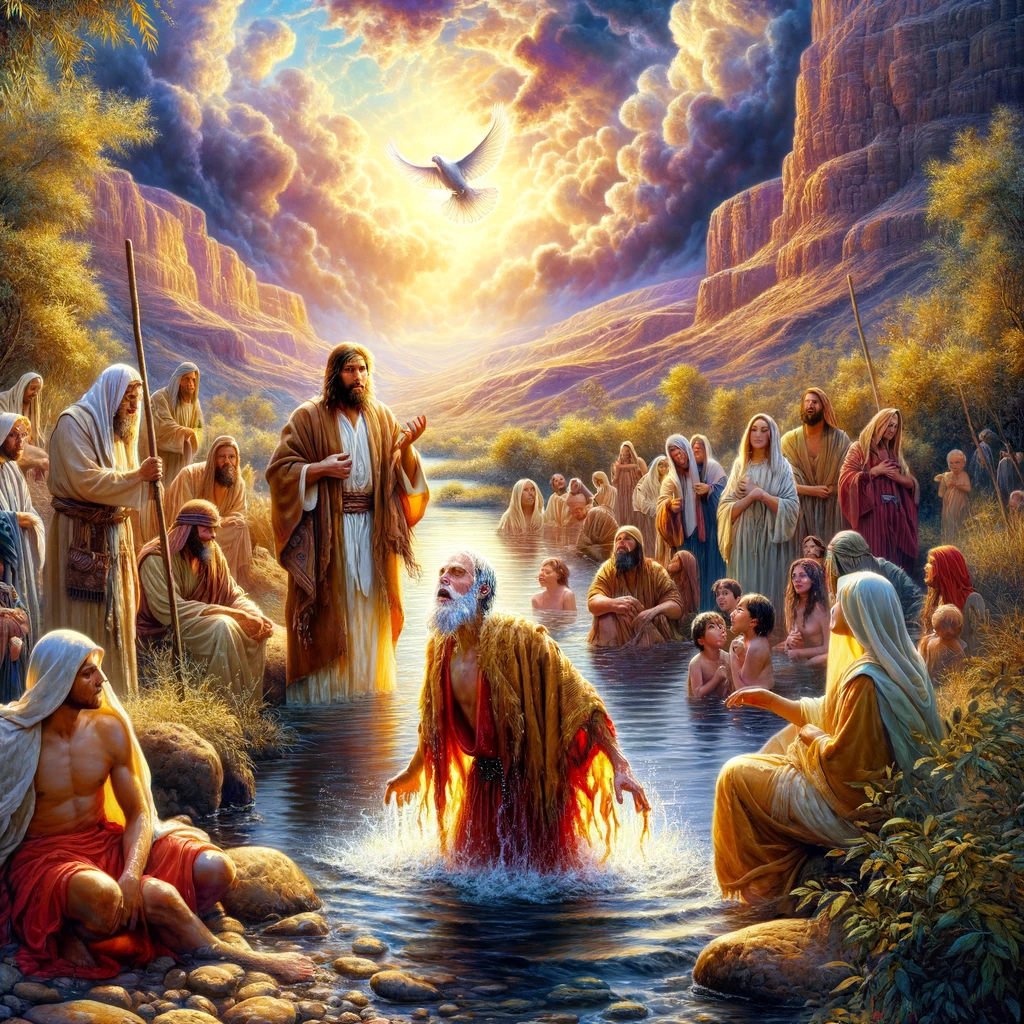The image vividly depicts the scene of John the Baptist’s ministry in the wilderness by the River Jordan, including the moment of Jesus’ baptism and the spiritual transformation it signifies.