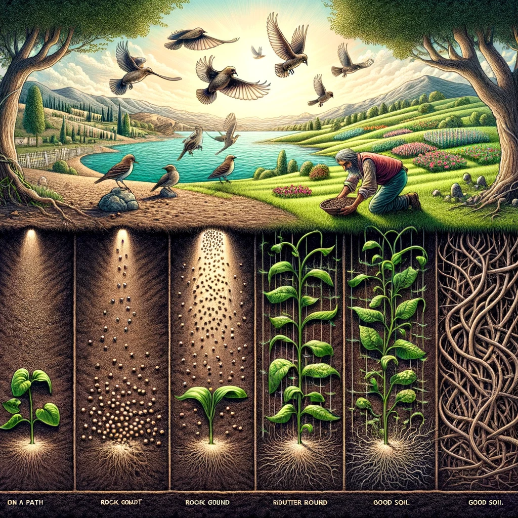 When His disciples ask Him about the meaning of the parable, Jesus explains that the seeds represent the word of God. The different types of ground represent the various responses people have to God’s word. Some people, like the path, do not understand the word, and so the evil one comes and snatches away what has been sown in their heart. Others, like the rocky ground, initially receive the word with joy but quickly fall away when troubles arise because they lack a firm root. Still, others, like the ground with thorns, hear the word but the worries of life and the deceitfulness of wealth choke it, making it unfruitful. But those who are like the good soil hear the word, understand it, and produce a fruitful yield.