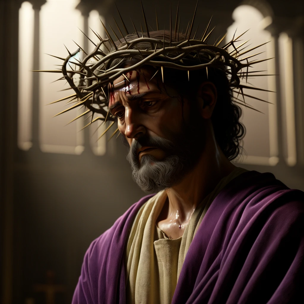The image has been created, depicting a symbolic scene where a teacher, representing a figure of truth and love, is adorned with a crown of thorns and a purple robe. It captures the teacher’s resilience and understanding amid the symbolic representation of pain and mockery, reflecting the internal struggle and higher truths of existence.