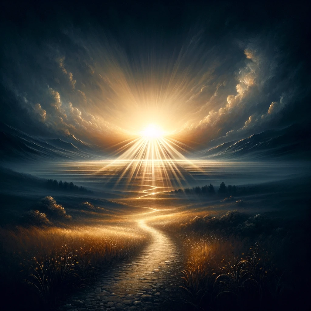 Here is a symbolic and respectful interpretation of the biblical concept you described, focusing on the themes of hope, salvation, and the triumph of light over darkness. This image portrays a serene landscape at dawn, with the first rays of sunlight breaking through the darkness and illuminating a path towards a distant, radiant light.