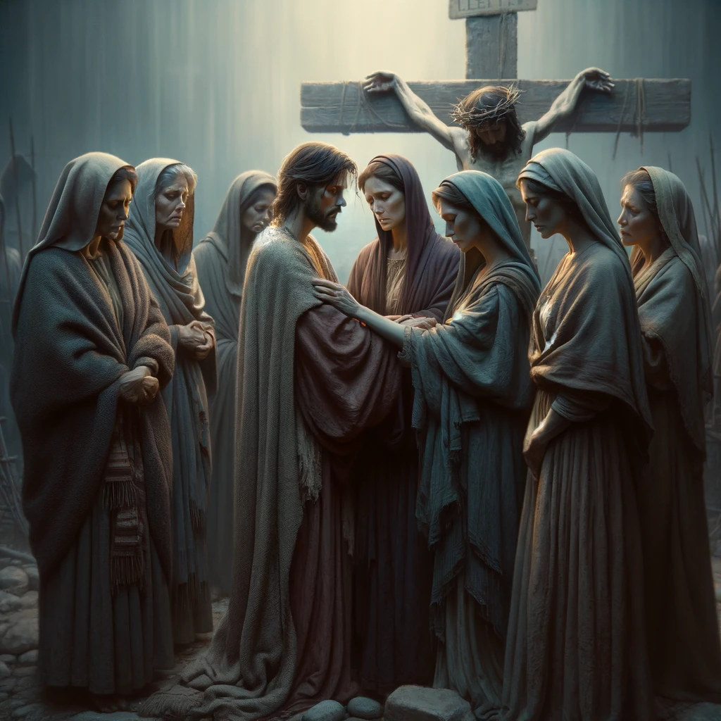 The image has been created, depicting the scene where the mother of Jesus, his mother’s sister, Mary the wife of Clopas, and Mary Magdalene stand near the cross. It captures their state of grief and solidarity, reflecting the solemnity and emotional depth of this moment.