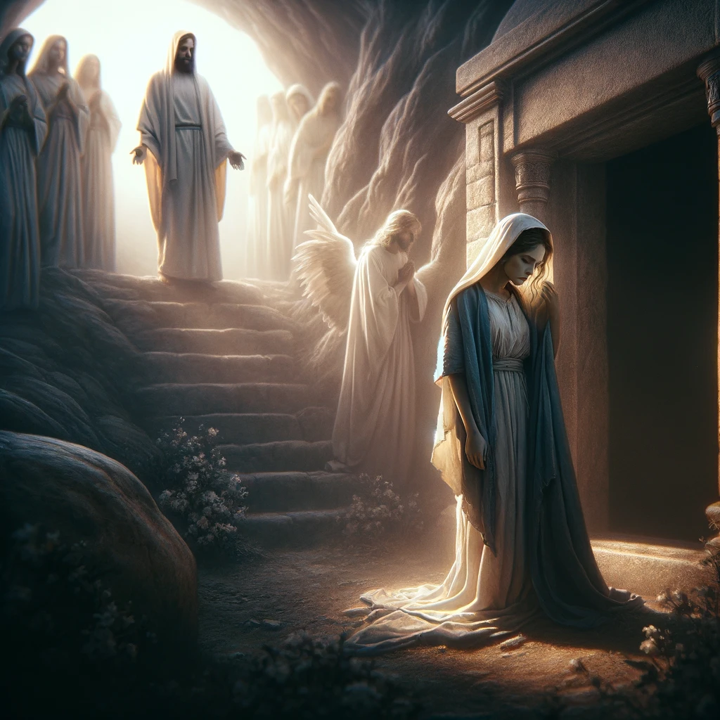 The image has been created, depicting Mary standing outside the tomb, weeping. It captures her state of sorrow and contemplation, along with the subtle presence of angels and the gradual recognition of Jesus, symbolizing the journey of the human soul towards understanding and acceptance of the divine.