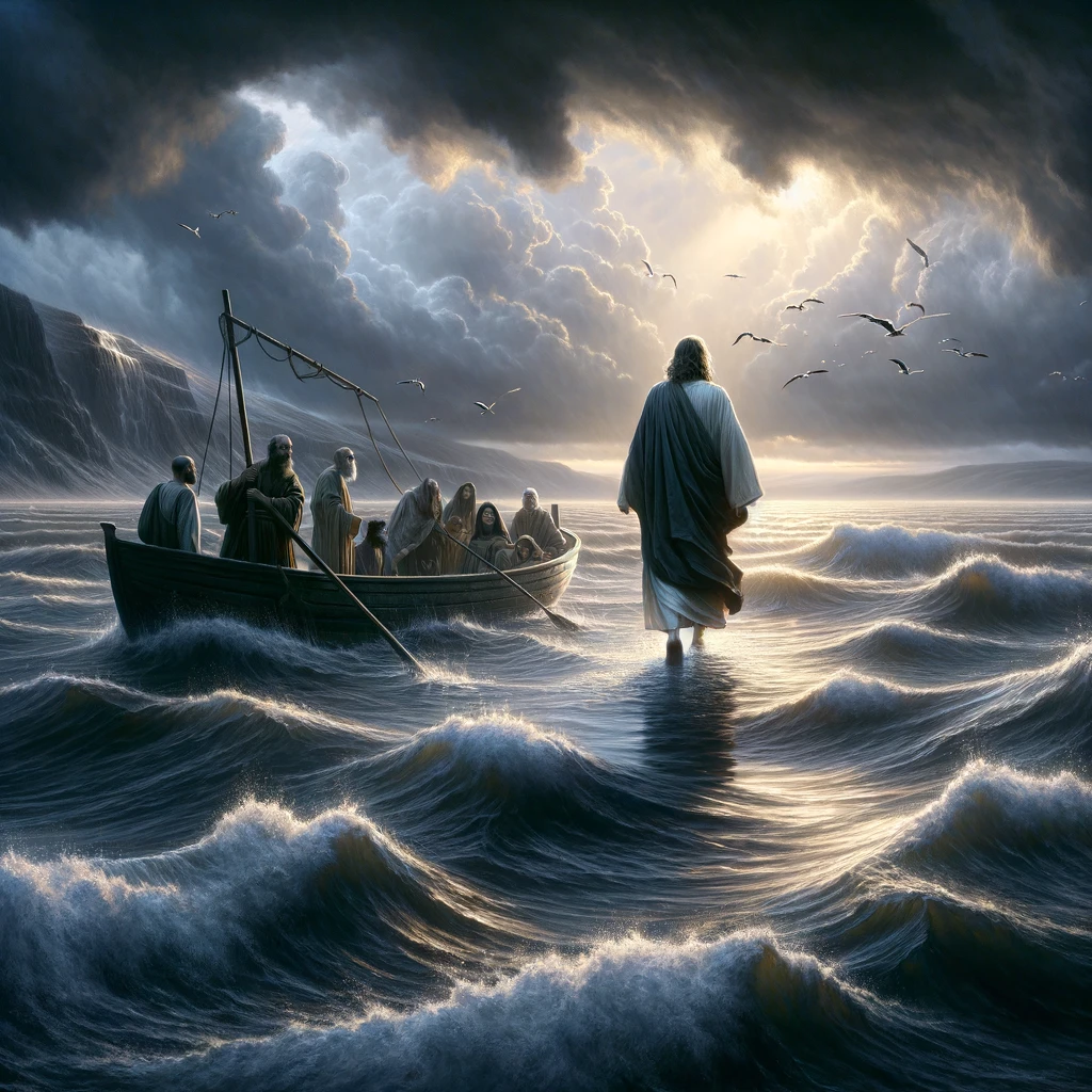 An image capturing the scene of ‘The Walk on Water’ has been created. It depicts the teacher walking calmly on the sea amidst a stormy evening, approaching the disciples’ boat, symbolizing his ability to bring peace in turbulent times.