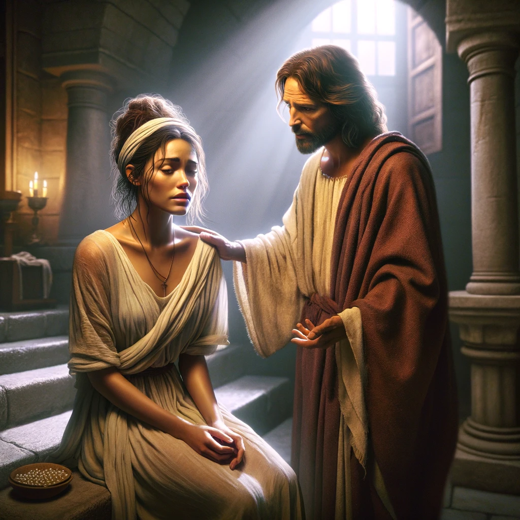 The image has been created, depicting the scene where an adulterous woman in distress is alone with Jesus in the temple, following the encounter with judgment. The portrayal emphasizes the themes of forgiveness and personal transformation in their interaction.