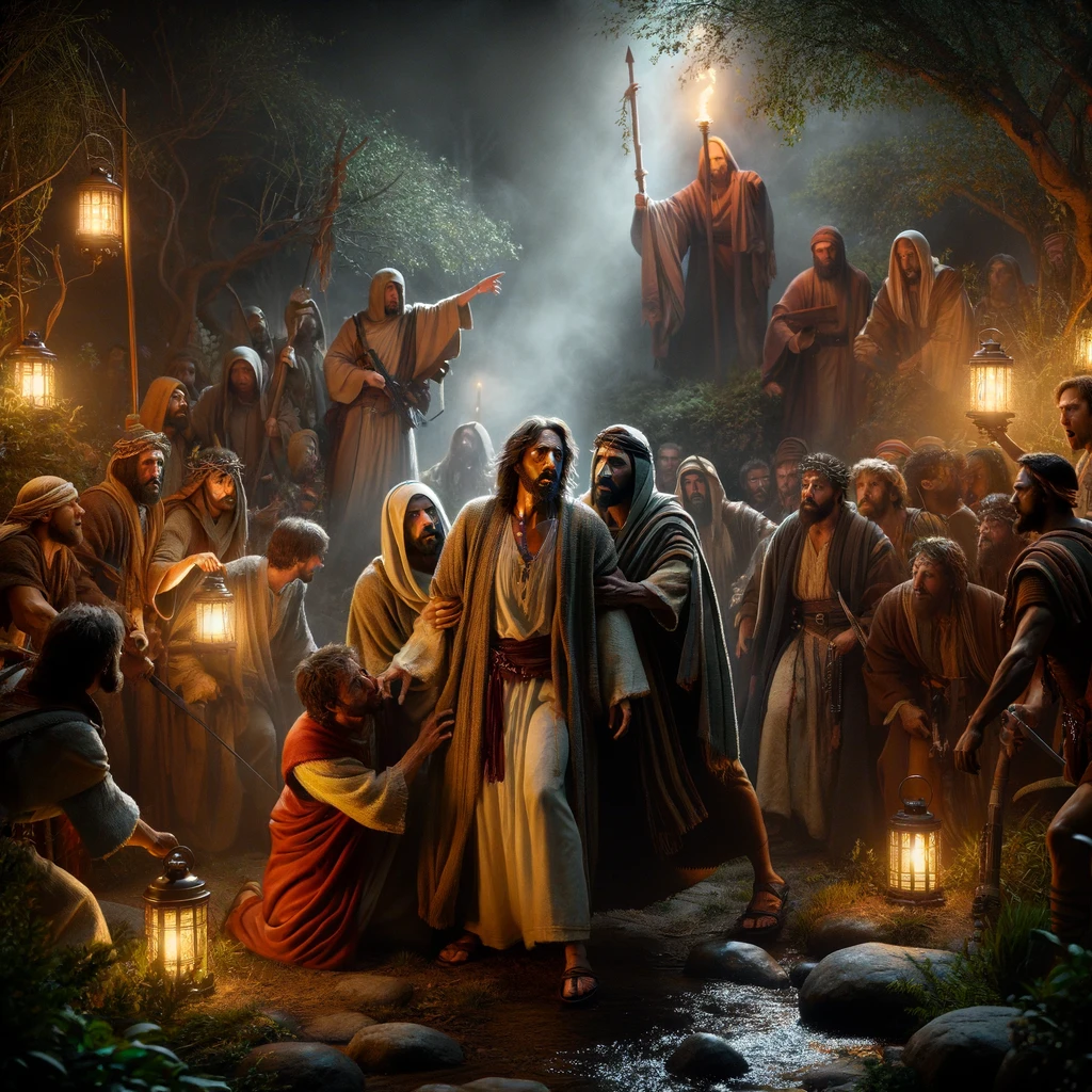 The image has been created, depicting the scene of the betrayal in a garden at night, where Jesus and his disciples are confronted by Judas leading a group with lanterns, torches, and weapons. The moment captures the tension and emotion of this significant event.