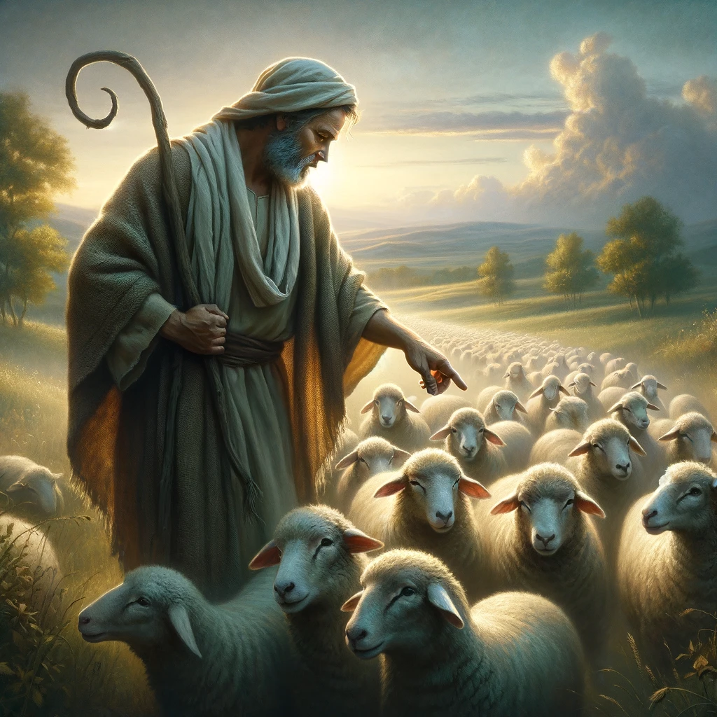 The image has been created, depicting the metaphor of the good shepherd as described by Jesus. It portrays a shepherd in a pastoral setting with his flock, symbolizing care, protection, and the bond between the shepherd and his sheep.