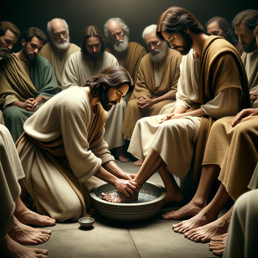 The image has been created, depicting the scene where Jesus washes the feet of a disciple, with exactly twelve disciples present in the room. The focus is on Jesus performing the act of foot washing, surrounded by the disciples in an intimate setting.