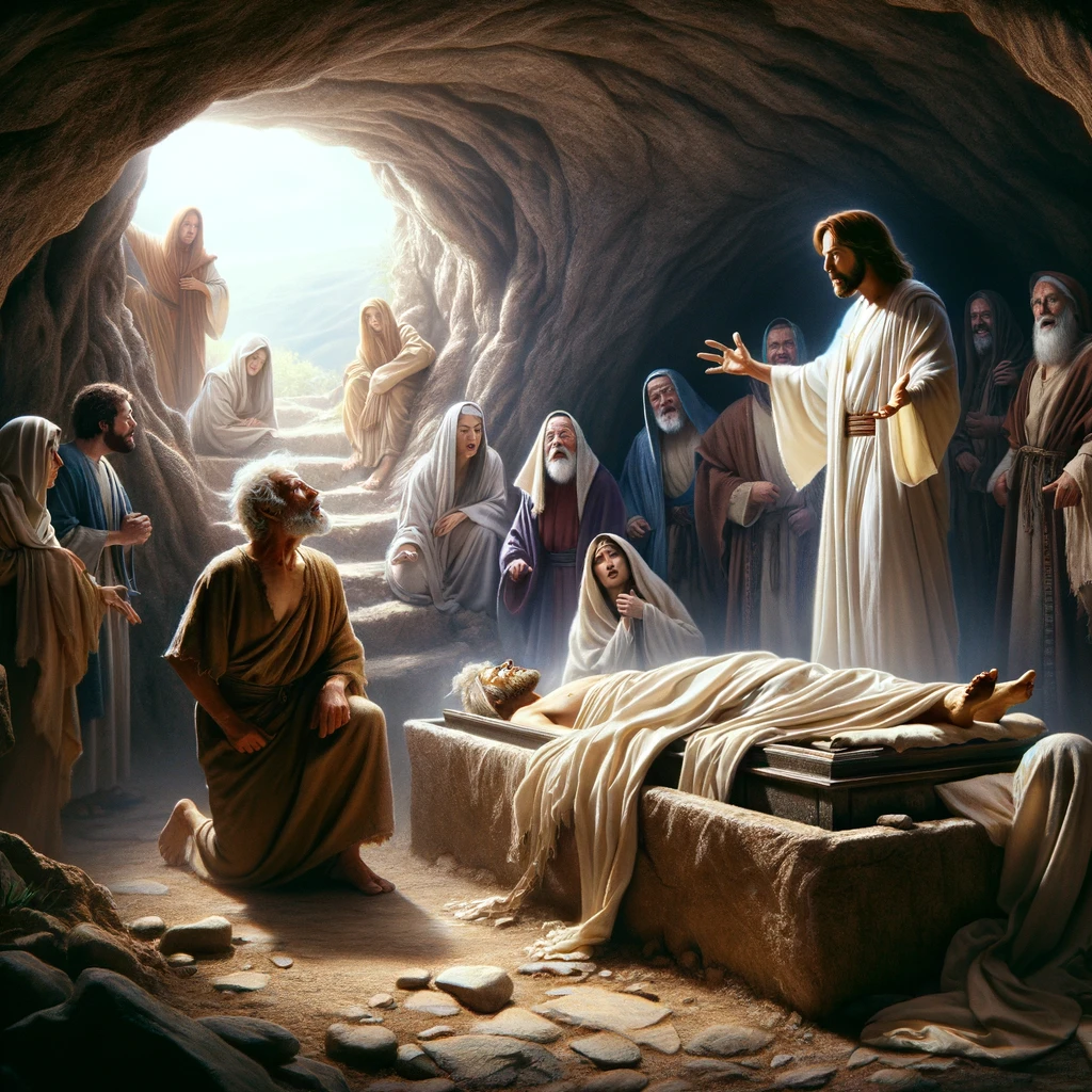 The image has been created, depicting the biblical scene where Jesus raises Lazarus from the dead. It portrays the moment Lazarus emerges from the tomb, with Jesus commanding him to come out, surrounded by onlookers in states of awe and disbelief.