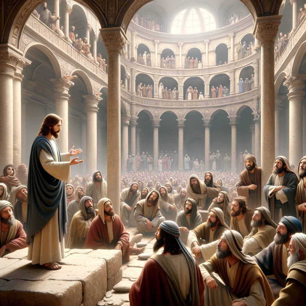 The image depicting the scene where Jesus teaches at the festival in the temple courts of ancient Jerusalem has been created. It captures Jesus engaged in teaching, surrounded by a crowd showing various reactions to his words.
