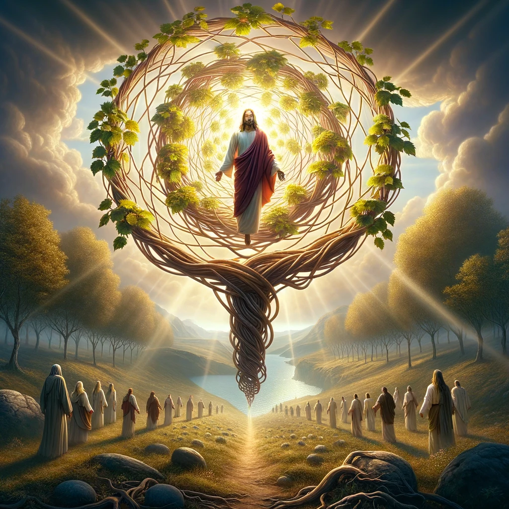 The image has been created, depicting the metaphor of the vine as introduced by Jesus. It illustrates Jesus integrated into a large, central vine, with branches extending around him to represent his followers, symbolizing the unity and interdependence of all life.