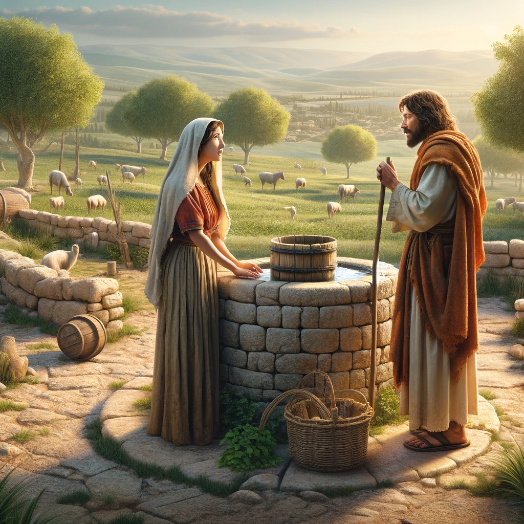 The image now depicts the biblical scene of the woman of Samaria and Jesus at the well, set in a serene outdoor environment with fields and trees nearby. The scene captures the peaceful interaction within this tranquil natural setting.