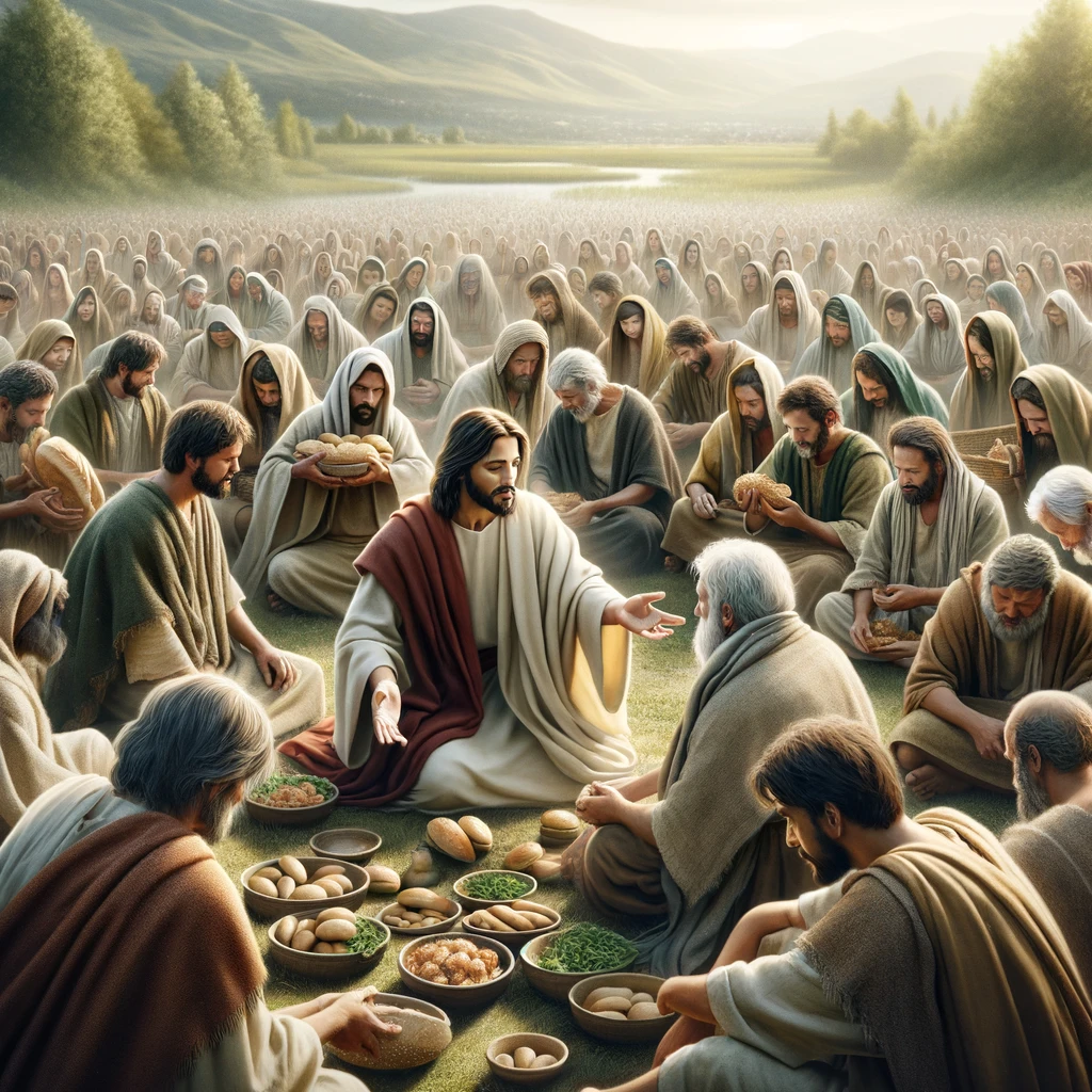 The image depicting the biblical scene where Jesus feeds the five thousand has been created. It portrays Jesus at the center of a large crowd, blessing and distributing loaves and fish, set in a peaceful outdoor setting with plenty of grass.