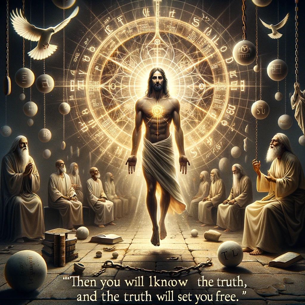 The image has been created, visually expressing the concept of “Then you will know the truth, and the truth will set you free.” It depicts the idea of true freedom as a release from inner limitations and misconceptions, with Jesus symbolizing enlightenment and spiritual liberation.