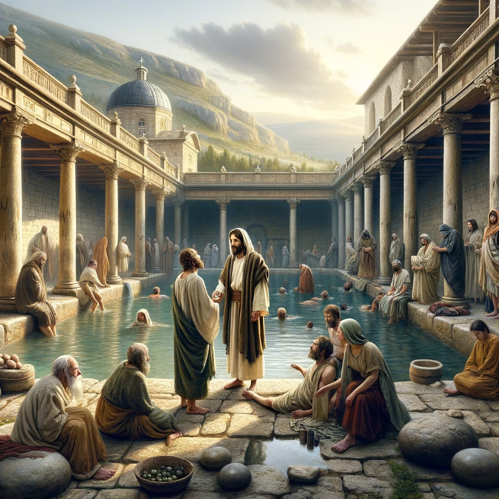 As the teacher moved through the land, he arrived in Jerusalem during a festival. Near a sheep market, there was a pool named Bethesda, surrounded by five porches. Here, many who were facing physical and emotional challenges gathered, hoping for healing.