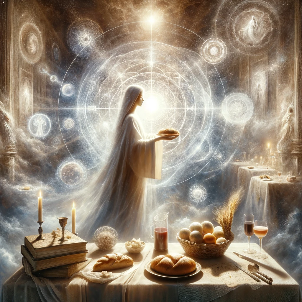 The image illustrating ‘The Mystery of the Living Bread’ has been created. It symbolically portrays the concept of spiritual nourishment and the deep, transformative connection with the divine source, focusing on the metaphorical rather than the literal interpretation.