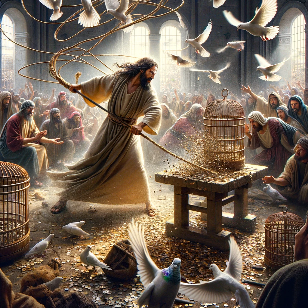 Here is the image depicting the scene of Jesus cleansing the temple in Jerusalem, with an intense and dynamic portrayal of him flipping a table over with a whip, sending coins and doves flying everywhere. The image captures the fervor and zeal of the moment.