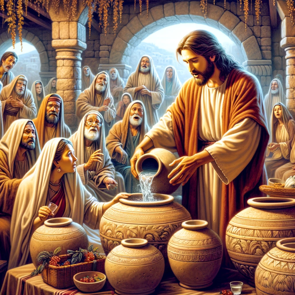 In a small village named Cana, there was a joyful celebration of marriage, a symbol of unity and love. Among the guests were a wise teacher and his followers. During the festivities, a challenge arose: the wine had run out. The teacher’s mother, recognizing the depth of his understanding, turned to him for a solution. She trusted in his wisdom and guided others to follow his instructions.