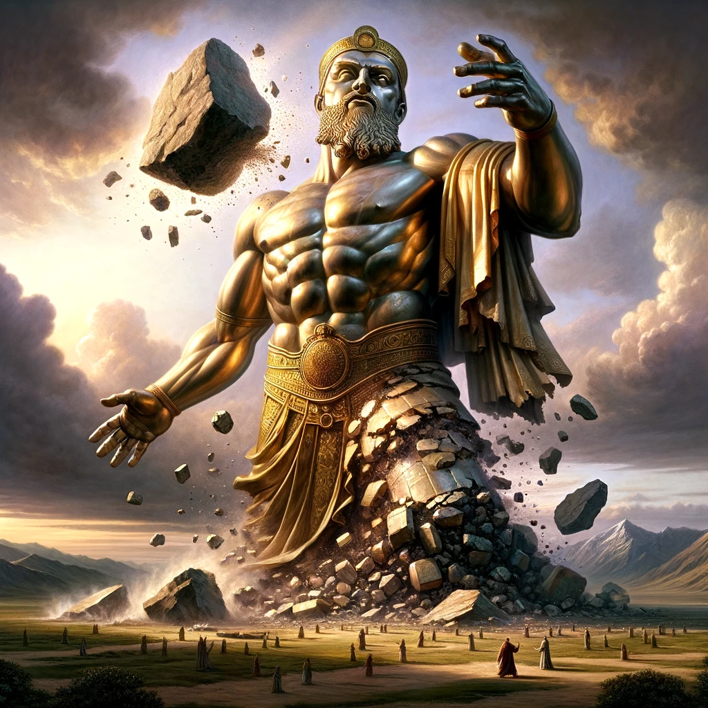 Here is the image depicting the dream described by King Nebuchadnezzar, featuring the huge, shining statue of a man and the dramatic moment of its destruction.